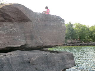 Arriving at the island side, we met my brother, a business friend of Dennis’s, and a nice family of hitchhikers all in the first half hour. At the state park for the next couple hours we (meaning the combined group of young and old) visited the beaches, the jumping cliff, the campground and the forest trail and it was all beautiful.  At the jumping cliff, my brother was the only older person who jumped the 20 feet into the bay, but all the younger ones were doing it.  At this point I would have liked to be in my bathing suit, but of course, I wasn’t.  Jumping off the rock is going on my bucket list though.  I did get my feet wet and climbed some rocks.