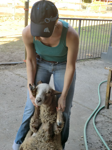 | Julie and Sheepie demonstrating proper sheep holding technique. |