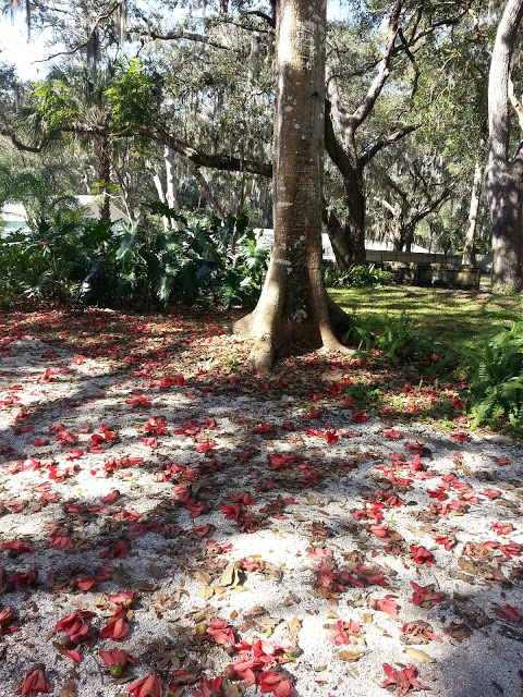 Okay, I’m all calmed down now. I even managed to snap a picture on the route, in our yard.  It is time for the kapok tree to bloom and, well if there were a nice word for litter I would use it, but I don’t think of one now. You don’t want to stand under this tree. The flowers are big and meaty and they come from waaaaay up high. They’ll dent your car. But they make a pretty red covering for the drive.