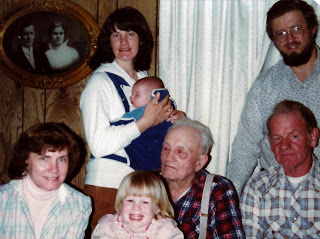 | My maternal grandparents John and Clementine, in picture on the wall, Me, holding Esther and Dennis in back row My Mother Gwen, Julia, my paternal grandfather Roy, my Dad Owen taken in 1982 |
