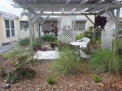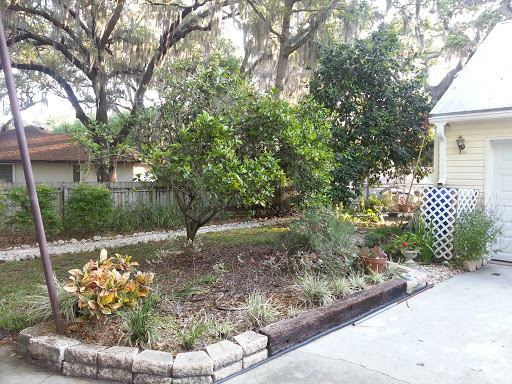 | Newly trimmed orange tree, and the rose and rosemary garden |