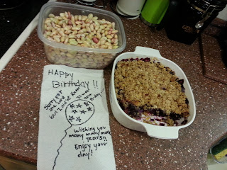I came in to the workplace (my client’s kitchen) and found this sweet little combo. The card and gift balanced nicely with the to-do list and I felt quite celebrated. The night nurse left me a little birthday note on a paper towel and the housekeeper came by later with ingredients for a pie, which she put together and put in the oven. I have birthday berry pie! She had also seen my birthday come up on her facebook page and had left me a whole flat of strawberries on Saturday. Her teen-age daughter gave me some already shelled speckled butter beans to cook. They are amazingly good, I have discovered. I love my friends at work!