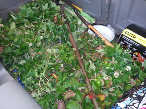Backing up a bit, Tuesday I did have a birthday adventure worth mentioning. I had asked a friend who has a large fruit/vegetable farm if I could have some of their post-season strawberry plants. Down here they plant large fields of them every fall and when they have fruited and been picked, they plow them under. However, being from a different climate originally, I am well aware that you can keep strawberries growing and they will make new plants for the next season. It’s a lot hotter here and they need proper protection and watering but the plants can survive the heat – I have done it successfully before, once. I haven’t done it since because I haven’t had a place to plant them and the initial cost has been too much. Strawberry plants in the garden stores cost up to $3 each. But my friend said to get all the plants I wanted, so I did. I got a couple helpers and we dug up close to 100 plants and brought them home. I planted 50 that afternoon and have given some away and have a few still to plant.