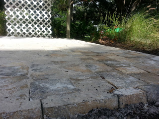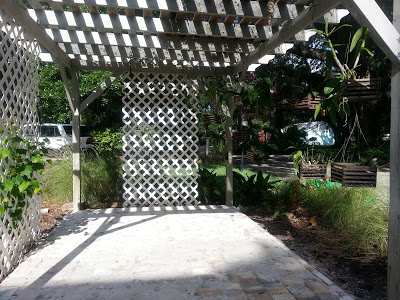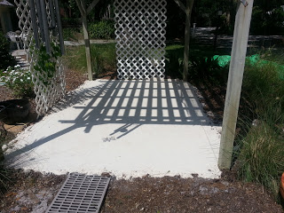 So last year for my birthday some friends put up a pergola for me. I learned that “pergola” in Florida cracker language is “shade shed” which kind of tells you what it is. I think I put up pictures of it being built. I’ve enjoyed most everything about it for the last year except the way my feet tracked dirt and mulch from there into the house every time I visited it. It had a floor like the rest of the garden it is in – dirt and leaf mulch, or rather we could say it never had a real floor. I got so tired of the mess that I covered it up with an old carpet which worked pretty well but looked very trashy. And embarrassing. So this year for the pergola’s birthday my project was to give it a proper floor. I was gifted with some money for my birthday which I figured would be just about right to do the job.
