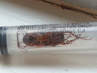 For instance, one day at work I entered the bathroom to prepare some equipment and noticed a syringe on the counter. We use them a lot to hold alcohol or peroxide to clean equipment. On closer examination this syringe had something dark in it. Strange I thought. As I worked my attention wandered back to the syringe and then my imagination kicked in. The dark thing had legs and was really quite large. It looked like a roach, in fact, it was a roach. How desperate it must have been to have crawled somehow into that really tiny space. Roaches are ancient insects with a survival rate like no other. Did this one know he was doing something stupid from which he would never recover? Did he do it on a dare? Did someone leave this item on the counter for me to discover with or without a roach in it? Let imagination run.