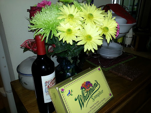 Another holiday blessing was my evening meal. I planned it and cooked it myself, but not to feel sorry for me – it was fun. When I have all afternoon to putter in the kitchen and pay attention to all the details, putting on a dinner is a relaxing delight. Guests were my aunt and uncle Brennen, and the bachelor Carroll, and our monthly dinner partner Jack. Jack is always aware of gentlemanly obligations and was trying to make up for my day slaving in the kitchen. He brought me wine, flowers AND candy.