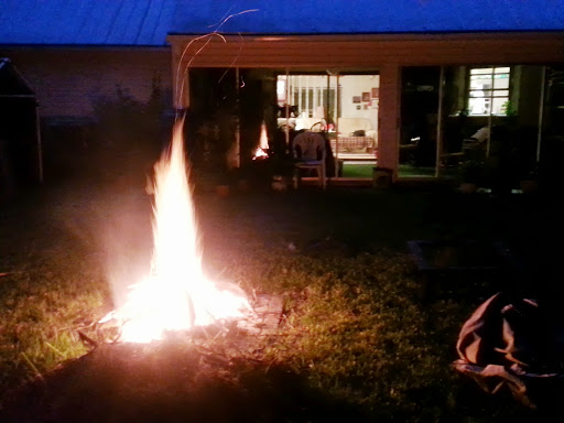 After pulling weeds and propping up frangipani trees it was still not completely dark so I decided to burn my brush pile. It had been growing and “curing” by the firepit for months and was getting intrusive on the lawn. I love to make fire. I burned it all. It was dark enough by that time that the reflection of the fire on the lanai window made it look like the husband’s favorite chair inside the house was burning up. Odd – I had to take the picture.