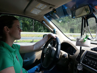 Her canine assistant sleeps on the floor behind her seat (nervously because articles in the shared space keep shifting and landing on top of her).