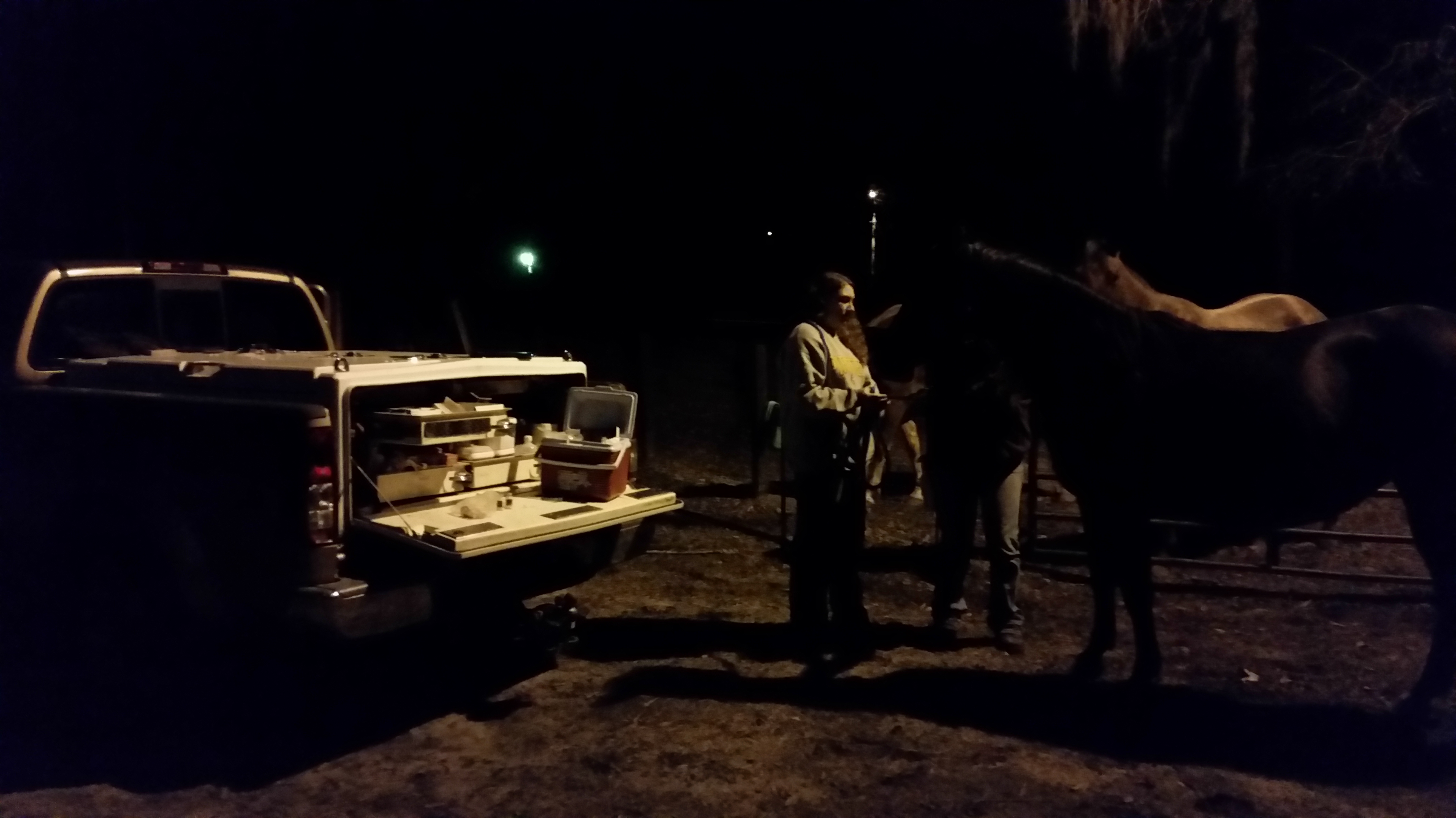 Today Dr. Julia had only one appointment and we were going to spend a good part of the day switching her vet box from one truck to another – a process requiring a lot of unloading and reloading and four strong men to do it. Unfortunately the doc has also been on call all day. It is now dark and she is still giving shots to Howdy, Whiz, and Li’l Snip.