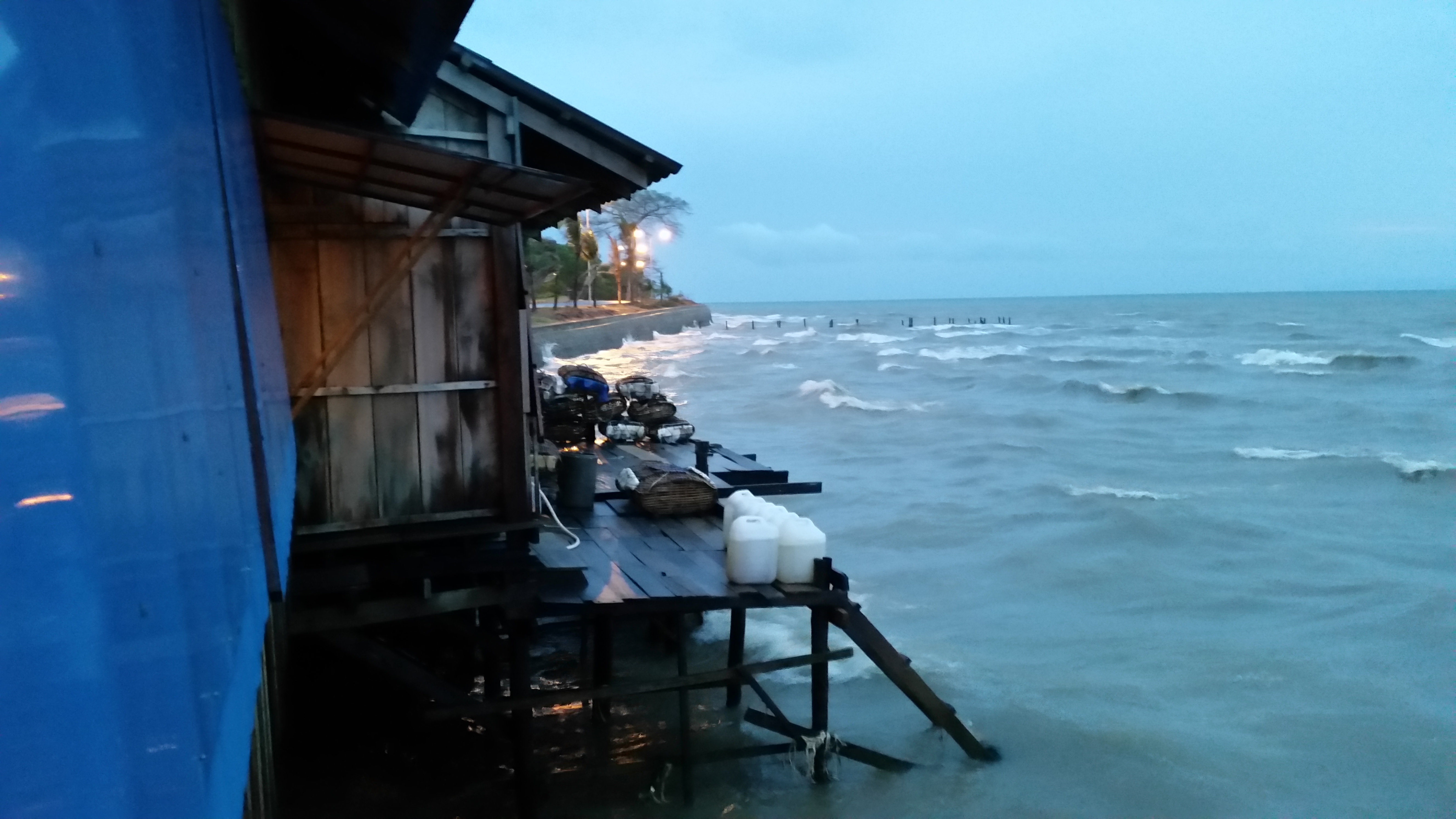 The evening meeting was held with some singing and a message by one of our team members. Then we all packed up and went by bus to another part of Kep where the Kimmley seafood restaurant was serving dinner. They have an open front to the ocean and the noise of the waves on top of the chatter of many voices gave me a very real listening challenge. To isolate an individual voice was hard. Things quieted down a good bit when everyone started eating. It was still raining and blowing outside so we had another power outage. Surprisingly the restaurant had a generator. I would hope they had a way to keep all their seafood cold… I ate conservatively this time, a mango shake and rice with vegetables. Julie had fried fish in coconut milk which came looking much different from what she expected and a bit scary.