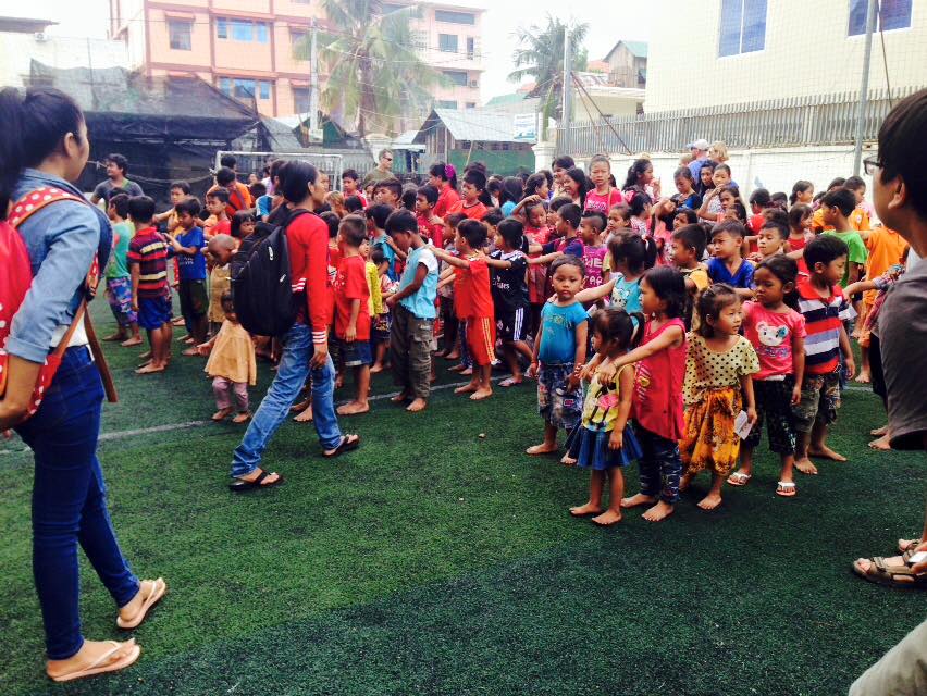 I don’t know what day it is anymore. Maybe Thursday. Today we went early to help with an outreach in one of the slum areas, of which there are many. The university dorm students are in charge of this endeavor and they do a great job. They are friends with a few older children who are given invitations to pass out in their neighborhoods. All the children arrived this morning at what is called a soccer field, but is really a rare empty lot with indoor/outdoor carpeting on a cement slab.