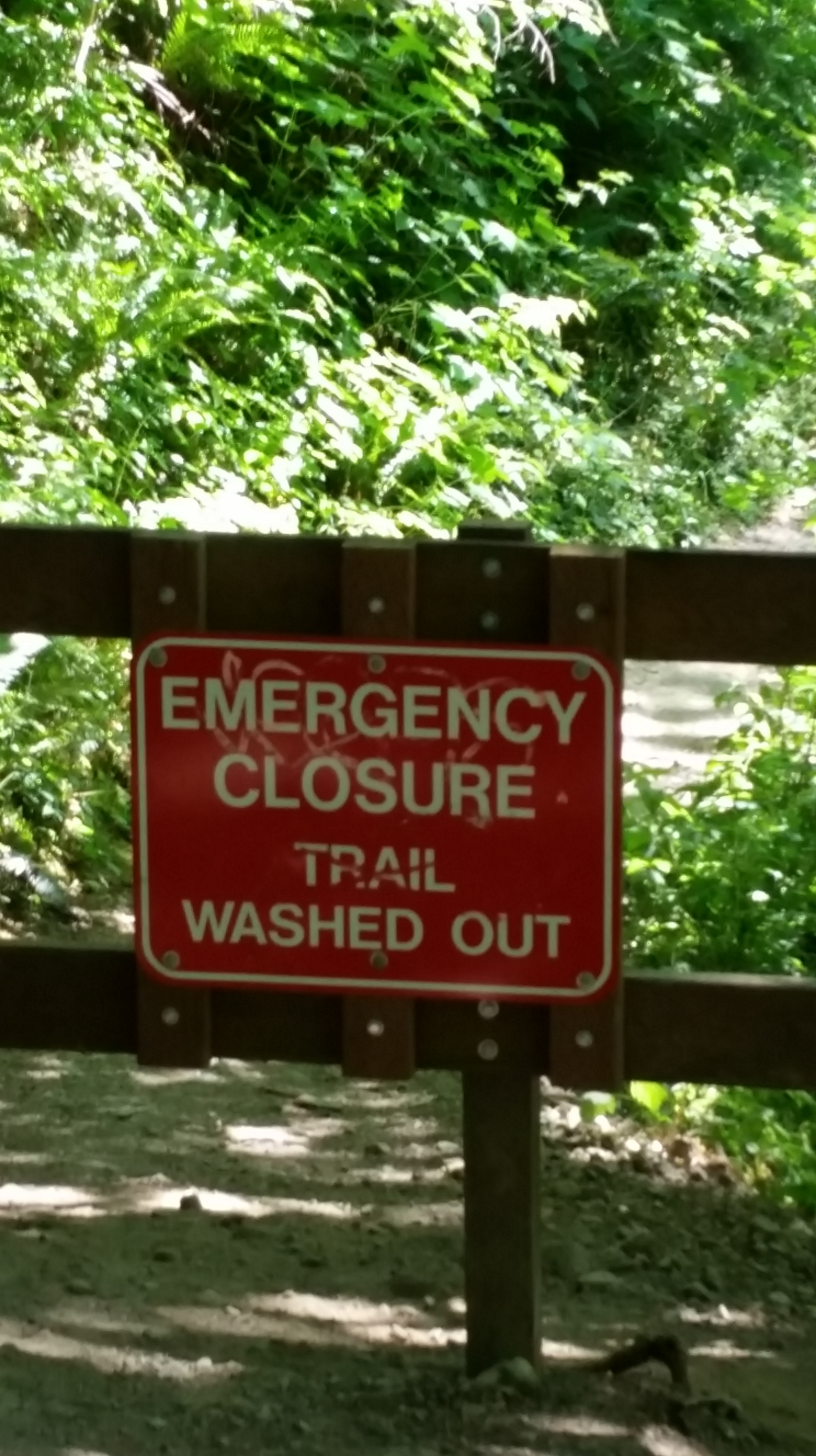 Could you not have told us this before we got way up here…? Thank you for the exercise.Switchbacks and rock outcroppings, old growth trees and ferns made the trail interesting enough, but when we finally got waaaaay up there we came across this fine sign. Oh great.