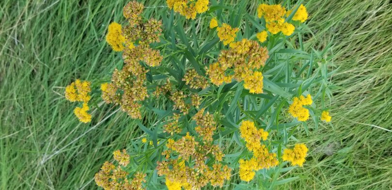 Gold to enhance the purple, drifts of goldenrod… and a flower we called “butter and eggs”