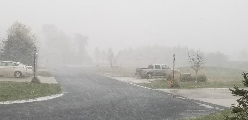 The grass is still green. There are still leaves on some of the trees. But, the white stuff is snow and it’s coming down as a storm.