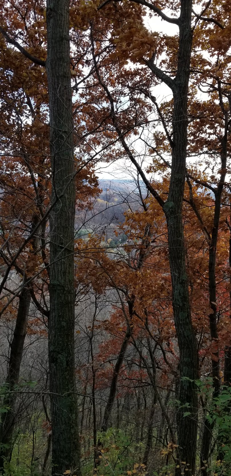 We stayed at my brother’s house on our last trip and I decided to take a hike up the bluff in the late afternoon. There were still lots of leaves on the trees, but the view through them was good enough to be impressive. This kind of natural beauty is so refreshing to me that I have to share it. Hope you love it too.