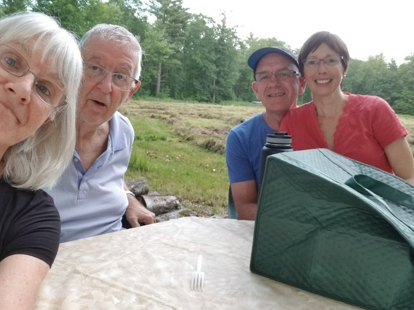 We are still at Smith Meadow, and tonight we had our first dinner guests. The menu was my secret recipe Macaroni and Cheese with a salad, watermelon and raspberry cream cheese pie for desert. Brother Dennis and sis-in-law Mary Pat came out to join us (they brought the pie)(and it was good!). This was such a treat for Dennis because he misses out on family dinners now that he isn’t comfortable at the condos.
