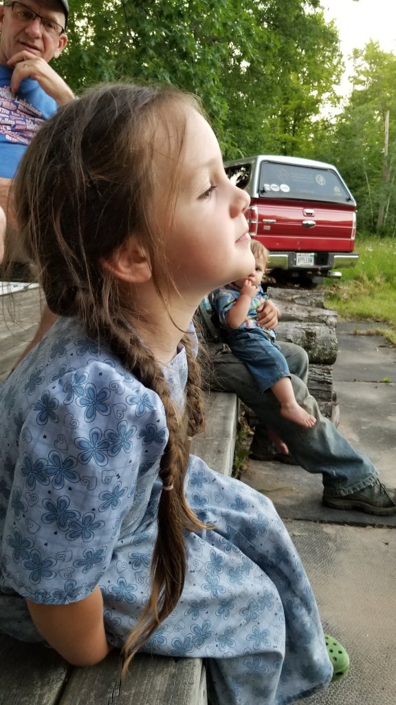 The girls sat next to me and conversed while we watched the field get processed. They were surprised when I told them many children don’t know what a farm is all about and think milk comes from a supermarket. We talked about cows, coyotes, their toy room, and how nice it was that their grandpa and grandma lived next door. Janessa, who is five, was the most talkative. She could have played Laura in Little House on the Prairie, if she had been an actress. But how much better to live the life and not have to pretend.