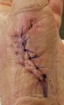 I finally got curious enough to look underneath it all. It was uncomfortable to the degree that I thought a re-wrap might help. The incision appeared to be healing well but there was a single spot of inflammation farther up the thumb that looked like it had a very thick suture drawing it in. “What on earth is that?”, thought I. That is definitely the place that hurts.