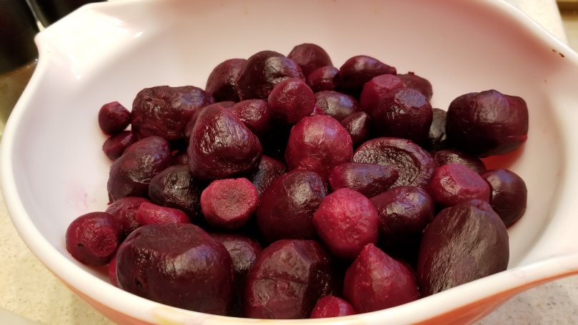 It is also birthday time. Mom turned 87 last Sunday and I couldn’t let that pass without having a few people over. Or twenty people over, which is what happened. Saturday night I was getting brunch ready for the party when I remembered the beets I had been planning to can or pickle, or at least cook. They are the last of the precious beet extravaganza that Mom and I harvested from the garden and, like I said, they were in that fridg, getting a little shriveled.