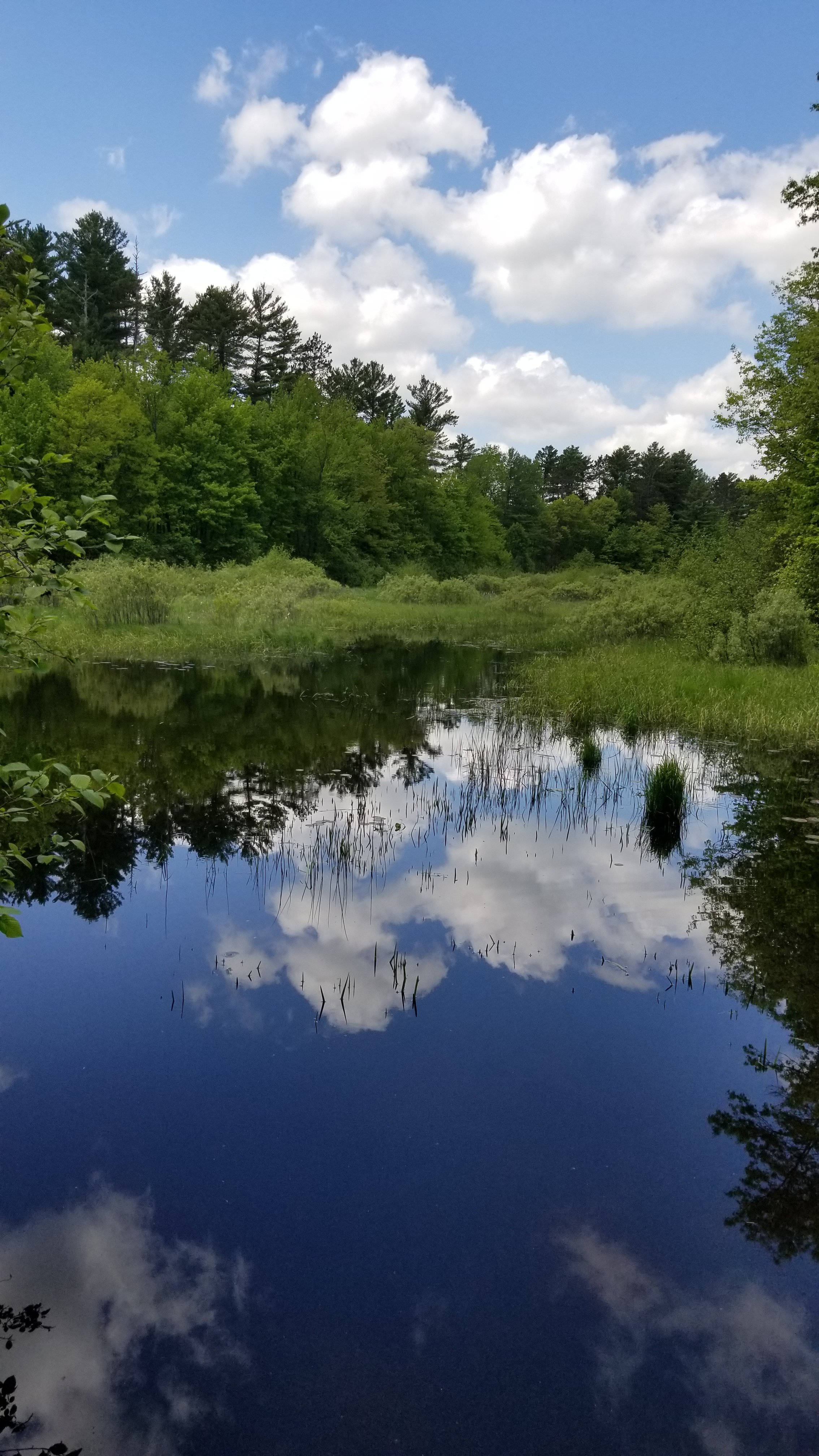 Yesterday’s walk was past a beaver pond and a large marsh. I pushed through the bushes to get a view of the water and watched a family of ducks swimming. The cattails started rustling and moving and out of them came the largest raccoon I have ever seen. It had a grizzled white head and was prowling through the marsh, probably looking for nests with eggs. Later I saw a pretty box turtle digging a hole in the dirt for her eggs