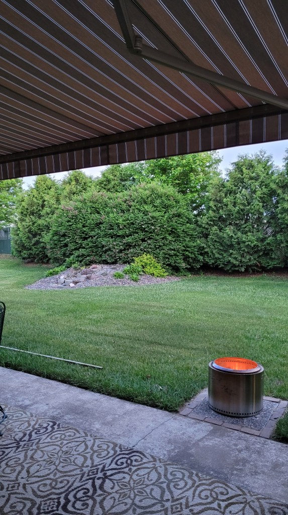 Last year I spent a lot of money on a retractable awning over the patio. I decided that I didn’t ever want to see that awning go up in flames or melt from the heat of my occasional outdoor fires in the SoloStove. So the platform of pavers sticks out a few feet into the lawn, out from under the awning. I had an hour to work before supper, and had already dug out the sod. I lined the hole with sand and set the pavers. It looks like it’s been there forever. I can’t wait to have a fire now.