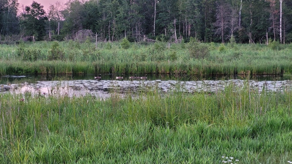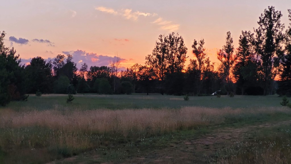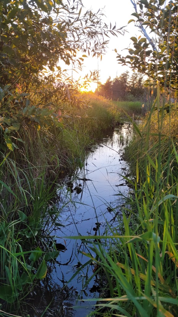It is getting late, almost 8:30 but I have sunlight still and it’s been a few days since I walked the wetland trail. We’ve had regular rain so the meadow is green. There are a few clouds but no wind. The sunset is getting better by the minute.