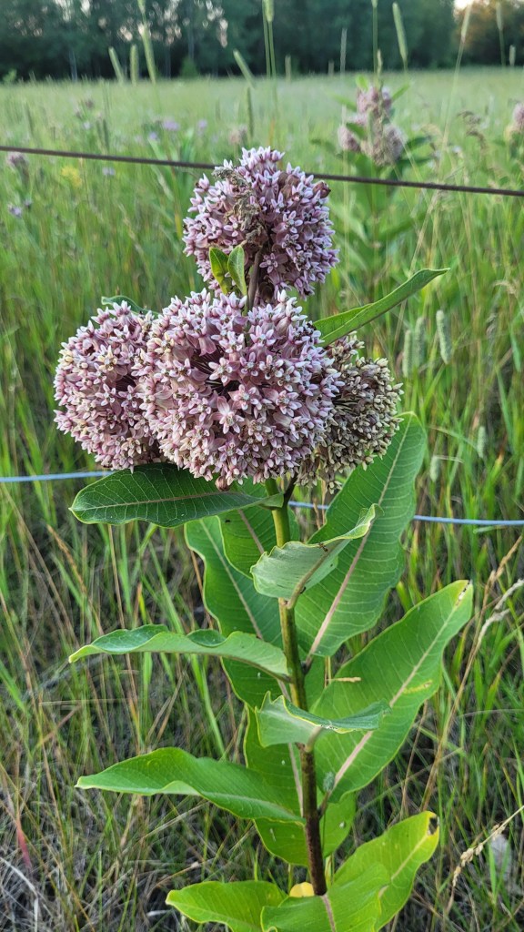 The first sections of my path go past fields where milkweed plants abound. They are in full flower now which makes for a rather stunning plant. I often see deer in the fields in the evening and tonight I got to lock eyes with this young fellow. I thought he was stunning too.