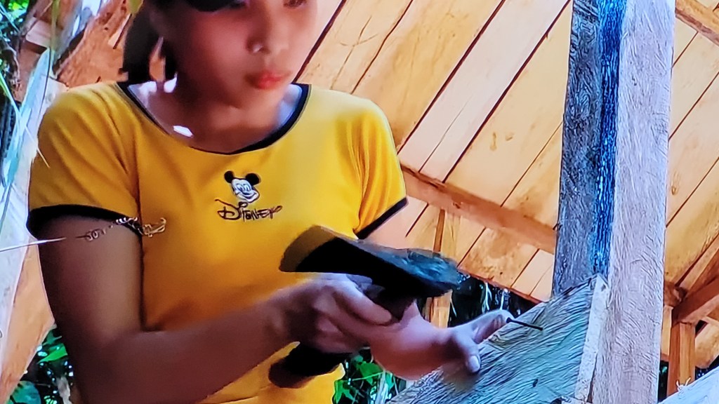 I didn’t always know what she was building, but could not stop watching her work. Her patience and willingness to do things the slow way with whatever materials she could find made me wonder if I would be able to work like that. One project at a time, she transformed her part of the jungle. It was nice to lose myself in her world where there were no sick people, no meetings to attend, no technologies or devices to drive her crazy – just a lot of plain, old hard work. (But I also wondered who was behind the camera, out there in the rainy jungle day after day.) It rivaled the other channel we watch – the cooking show from Azerbaijan.