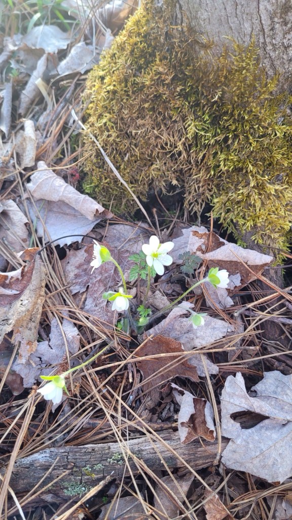 We always called them mayflowers, but I think that was descriptive of when they bloomed, not their actual name. White, pink, purple, blue are their usual colors and their stems have a delicate fuzziness to them. Sometimes a plant will have multiple blooms, sometimes just one. But they are life in the forest and I get a little thrill when I start finding them. It’s still April, so they are a bit early.