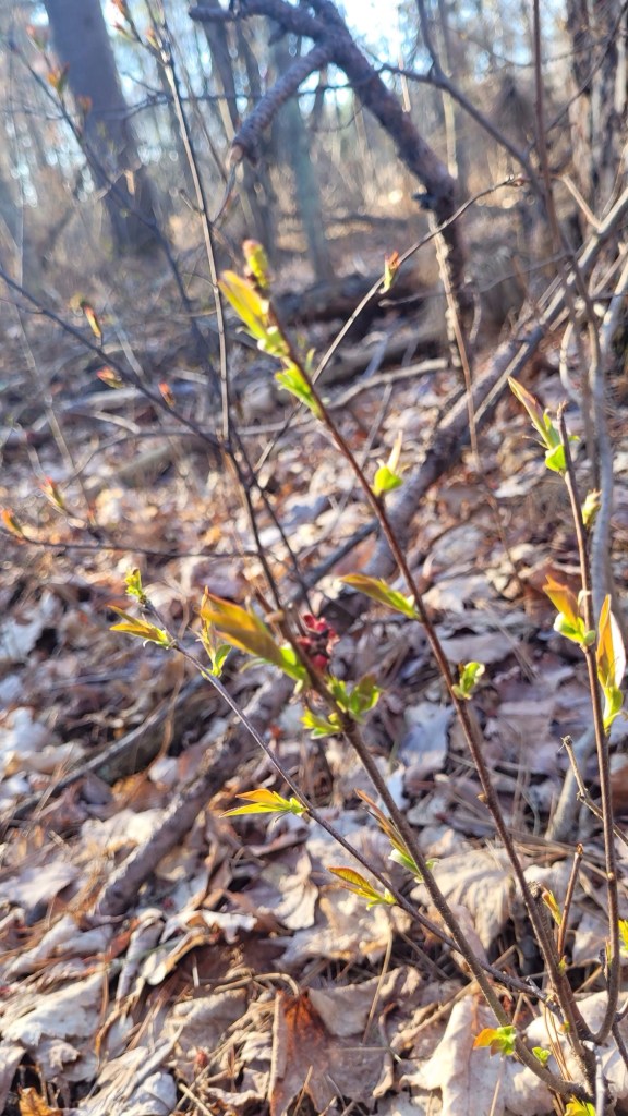 I walked this week in the woods, hoping to get some inspiration from my friends, the trees. The woods are still pretty barren. The buds on the trees aren’t prominent and the landscape is pretty brown and grey. But I am delighted to have seen some spring – the flowers are here.