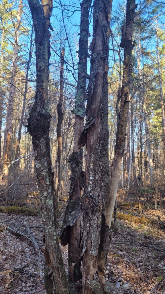 Maybe it’s because I am getting older that I notice aging in the forest more than I used to. I notice the older pines that are losing their lower branches, the ground around them littered with boughs that wind and snow brought down. I notice the dead trees, with bark peeling off and holes where birds have been hunting insects. Sometimes it’s a large tree that lost its hold and crashed down to the forest floor, its root bed sticking up in the air. There is a lot of destruction and death evident as a natural feature of the ecosystem. The woods looks quite messy at this time of year.