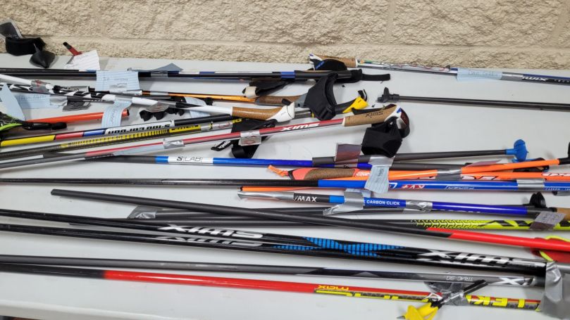 Broken ski poles are another common item in Lost and Found. Volunteers at the aide stations tag the broken poles with the bib number of the skier. Believe it or not, skiers want their broken poles back for the parts that come off them. Hand straps can cost $50 to $80. The baskets on the tips can be put on new poles. Skiers usually get a loaner pole at an aide station to finish the race. They return that when they pick up their broken pole.
