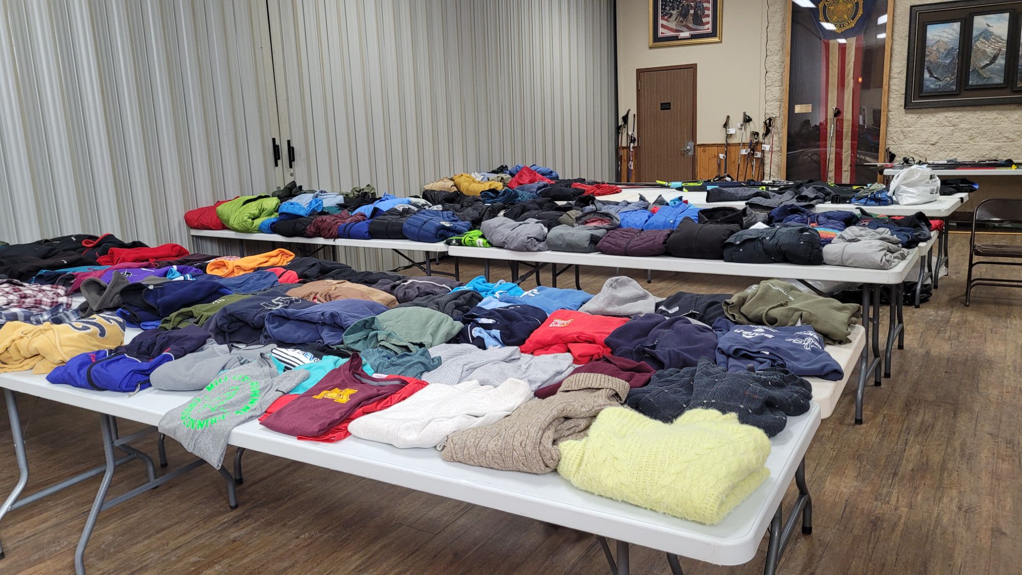 On Friday I stopped by my station to orient to my job. I met the couple in charge, my new friends Barb and Morris. Our workplace was a large room filled with banquet tables and a few folding chairs. Nothing had arrived yet. By Saturday afternoon the tables were filled with jackets, sweaters, broken ski poles, hats, and gloves. I was shocked. Didn’t people need their coats? I was told that most of the items would not be reclaimed. Other garments that did get claimed were ones that show up year after year. That was surprising, and led to my first “behind the scenes” revelation.