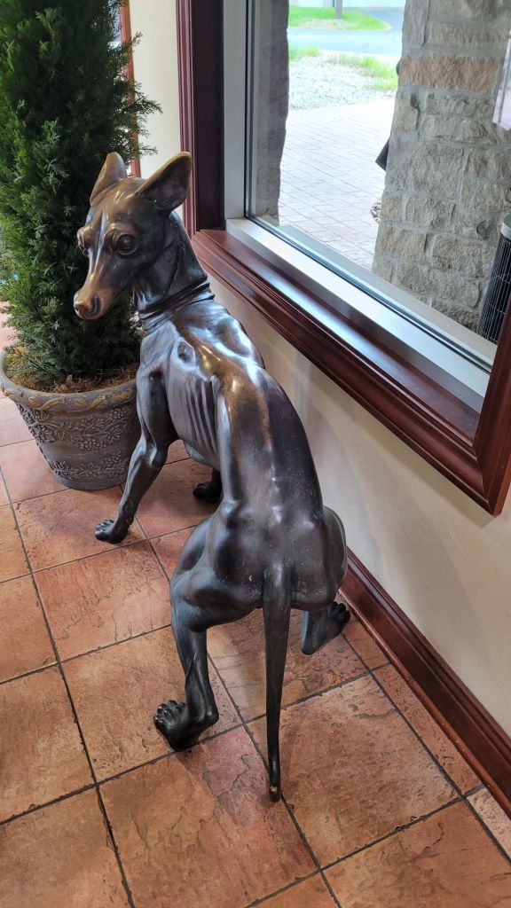 It took us over 6 hours to travel here from Hayward. We started at 9 and stopped for lunch at Rib Mountain State Park. The sign at Rib Mountain said it was the highest point in Wisconsin – 1940 ft. above sea level. That doesn’t seem very high, but at the top of the observation tower the view was WOW! This was in spite of the rain, and the wind gusting to 40 mph every now and then. I say lunch, but what I mean was that I ate an avocado and a yellow bell pepper, in the car in the parking lot. We did stop at Starbucks at the bottom of the mountain. We needed to warm up. It’s cold, in the 50’s, uncharacteristic of this time of year.