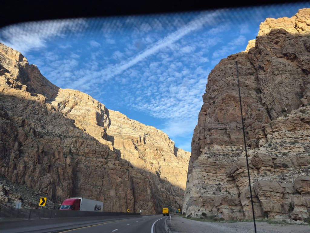 Our next stop was Parowan, a beautiful desert town in a valley. That day’s drive through parts of Zion National Park was spectacular. The Virgin River Gorge was… a real gorge! There is a 15 mile stretch of I-15 that winds through it. It was the most expensive stretch of highway at the time it was made in 1973. Photos were taken but they never do justice to the 400 foot limestone cliffs on either side. Wow. Wow.