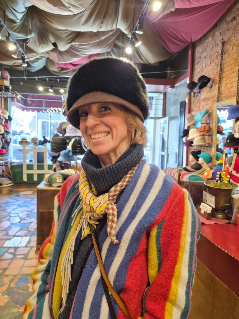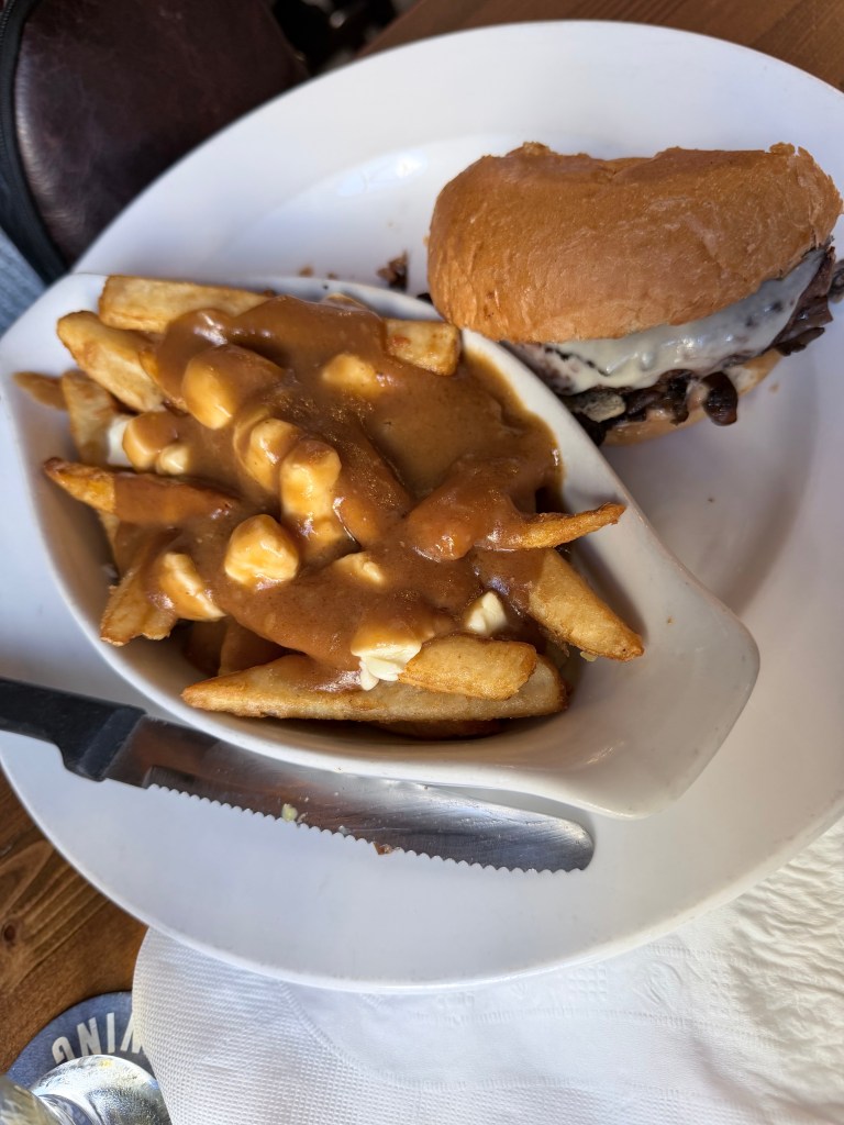 We continued down past the Empress Hotel, another historic place. The streets are impressive here. Many of them are closed to car traffic and are wide pedestrian walkways. There are many shops, both large and small, local and name brands. There is no trash, no boarded up windows. It feels safe and there are lots of people walking and shopping, eating in the restaurants. We found a hat shop. Esther is a hat girl and she did find a great one, but not this one.  We had lunch at Garrick’s Head on Government Street and I got to try poutine. It’s a Canadian specialty that amounts to french fries and cheese cubes with gravy on them. What’s not to like about potatoes and gravy?