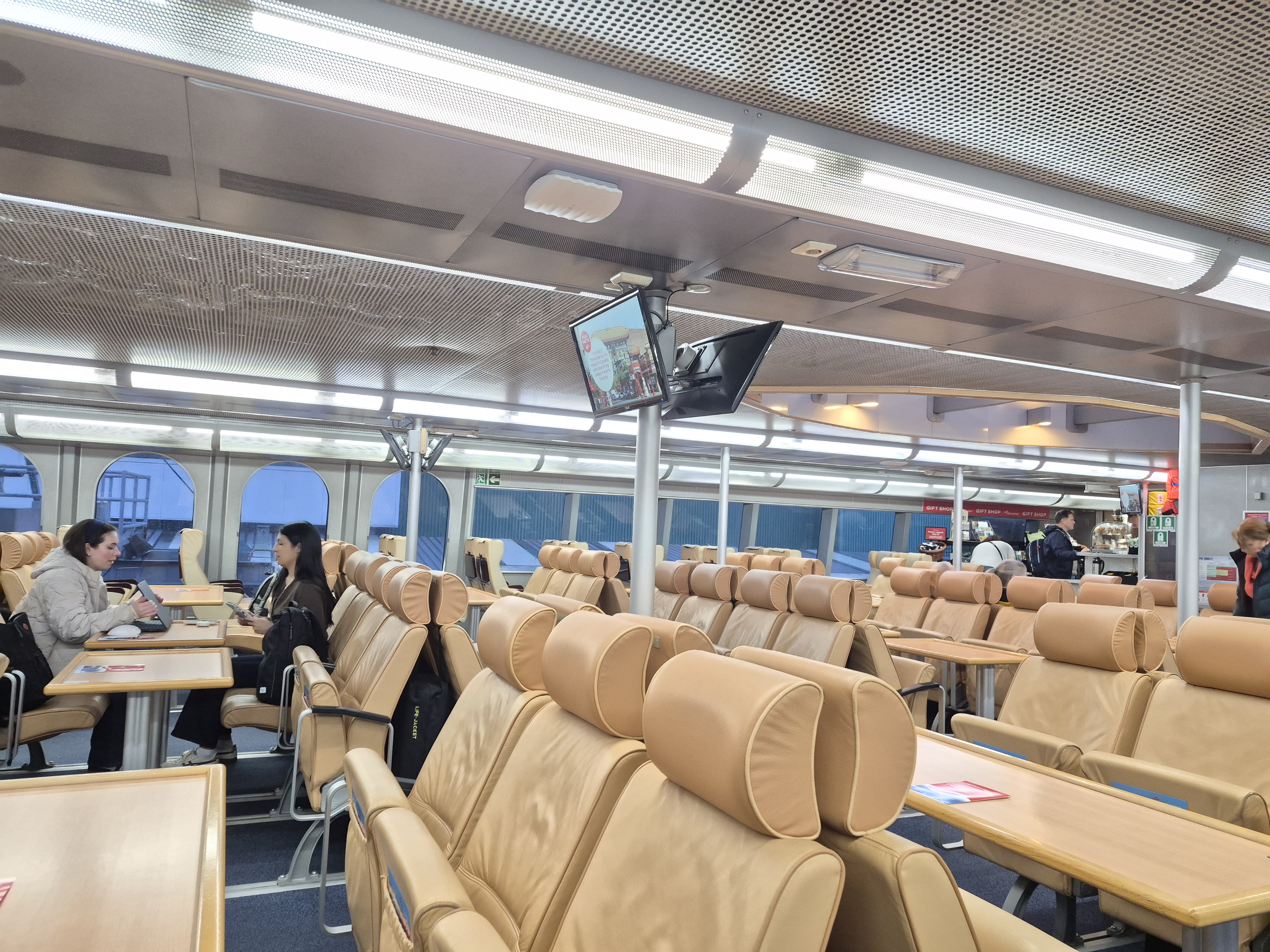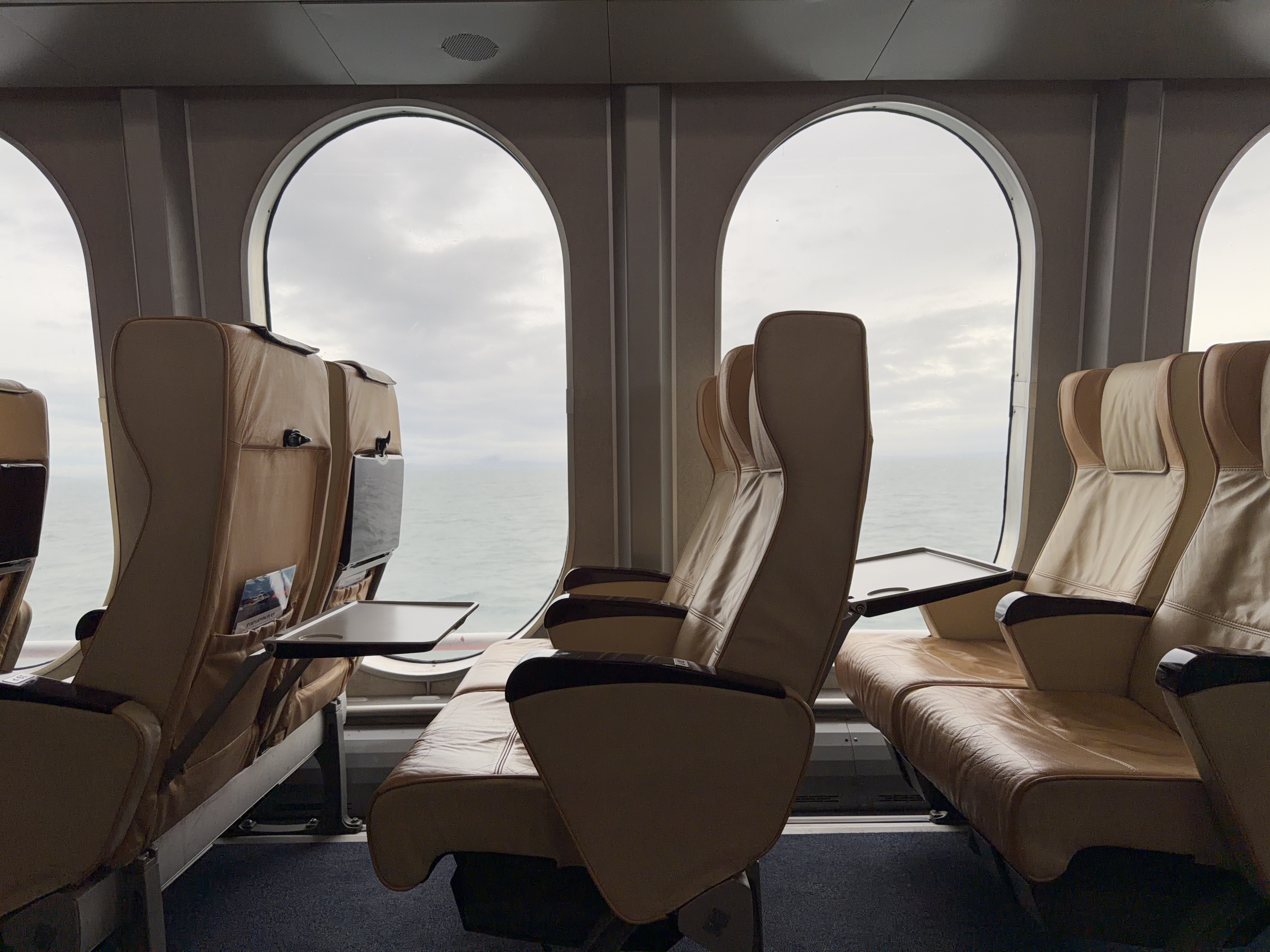 It was not a crowded space. We moved from our window seats to a table in the center of the room. We had breakfast from the clipper cafe during the 3 hour journey. For fun, we drew a collaborative picture and here it is. We each only saw our part when drawing. The boat travels at 30 knots, which is pretty speedy for a ferry. It was a pleasant and well conducted trip.