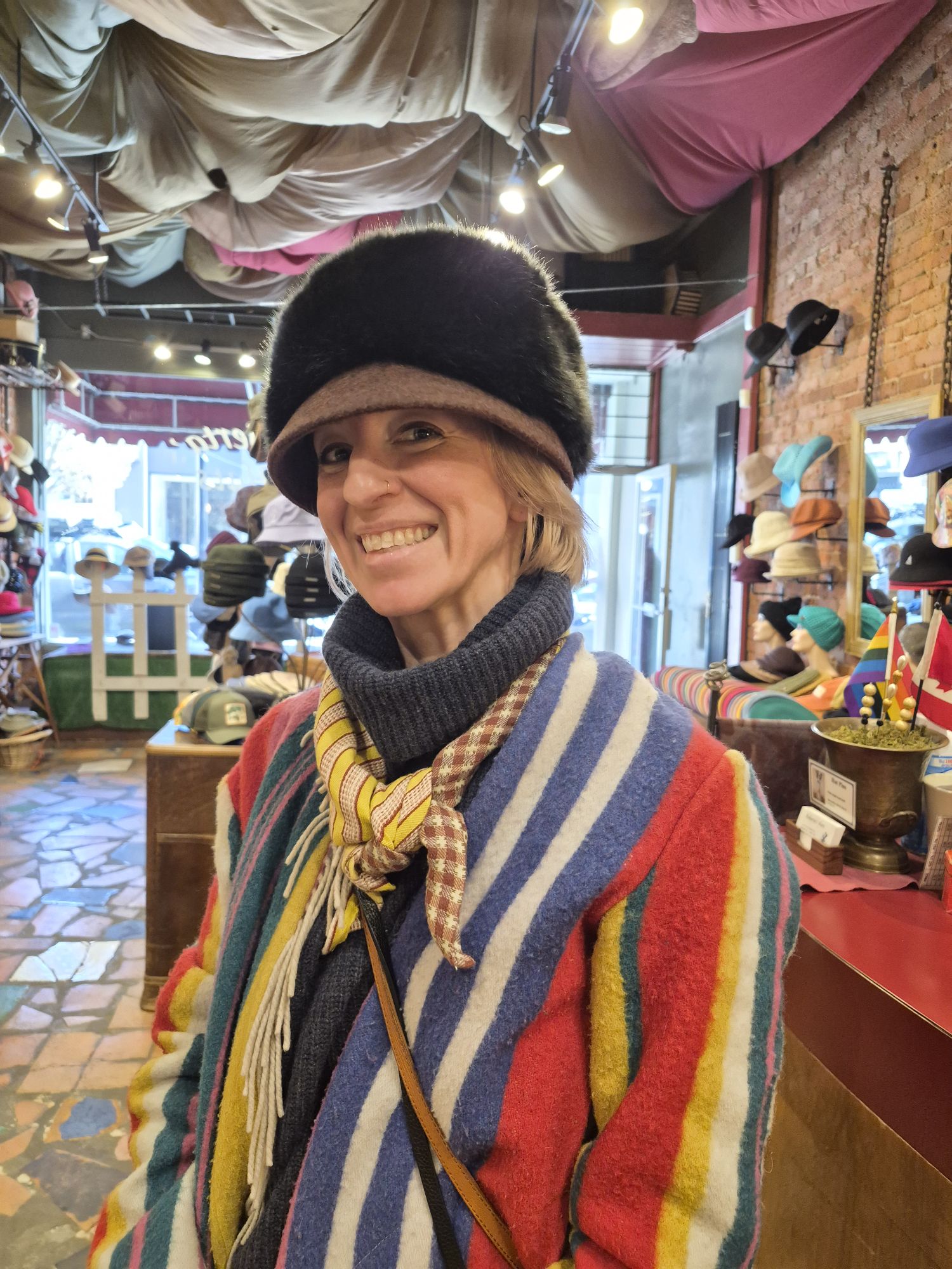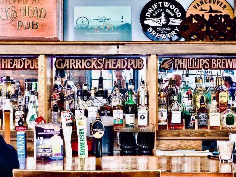 We continued down past the Empress Hotel, another historic place. The streets are impressive here. Many of them are closed to car traffic and are wide pedestrian walkways. There are many shops, both large and small, local and name brands. There is no trash, no boarded up windows. It feels safe and there are lots of people walking and shopping, eating in the restaurants. We found a hat shop. Esther is a hat girl and she did find a great one, but not this one.  We had lunch at Garrick’s Head on Government Street and I got to try poutine. It’s a Canadian specialty that amounts to french fries and cheese cubes with gravy on them. What’s not to like about potatoes and gravy?