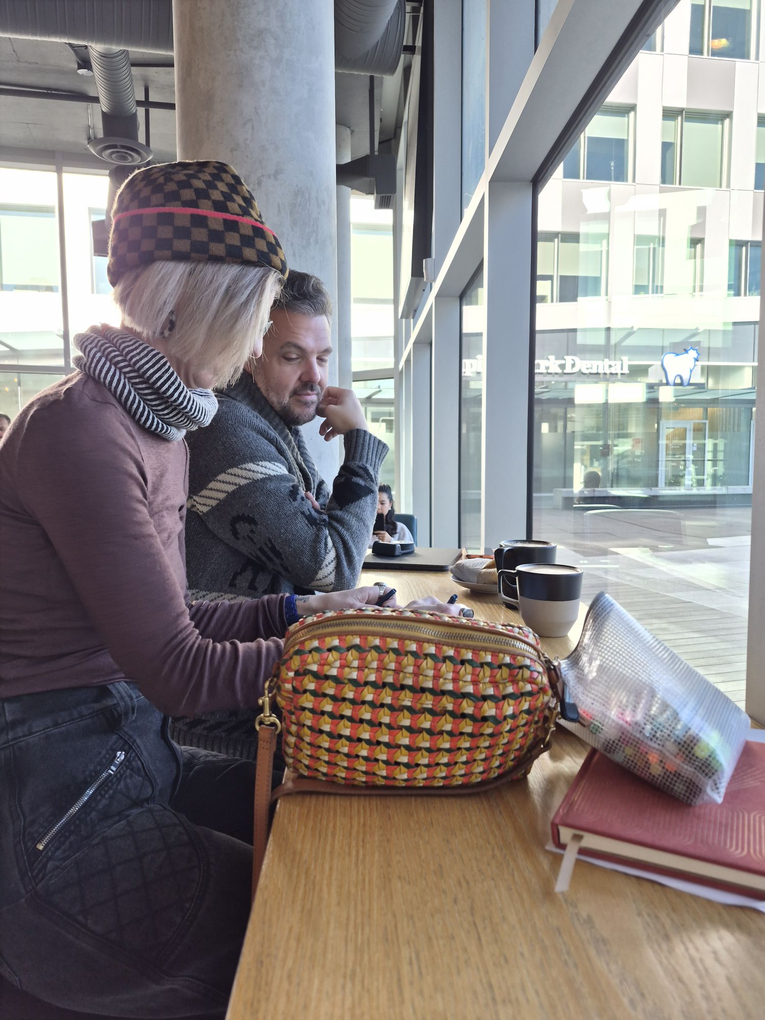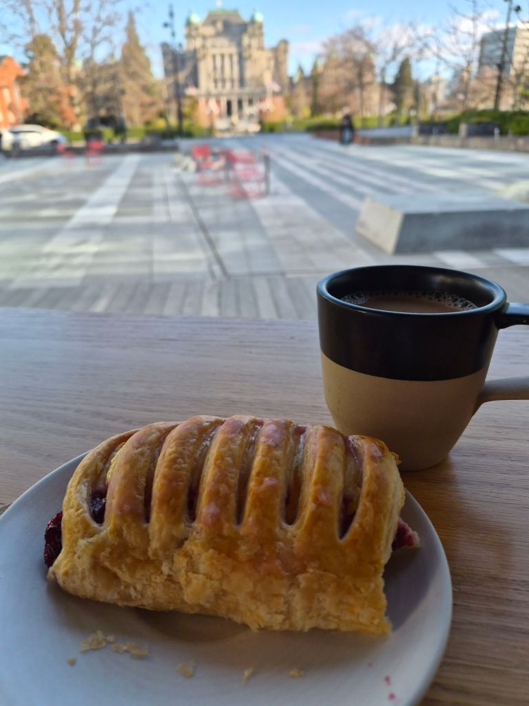 Part of the fun of any new place for Esther and Ryan is to find an interesting coffee shop, with REAL coffee (Esther’s description). Our morning walk took us to Good Earth Coffee, a shop in the Parliamentary Plaza. The coffee shop has to have good pastry too, and this one did. We sat at a ledge table along the picture window and did some people watching. Esther is working on her visual journal every day and got Saturday’s pictures started.