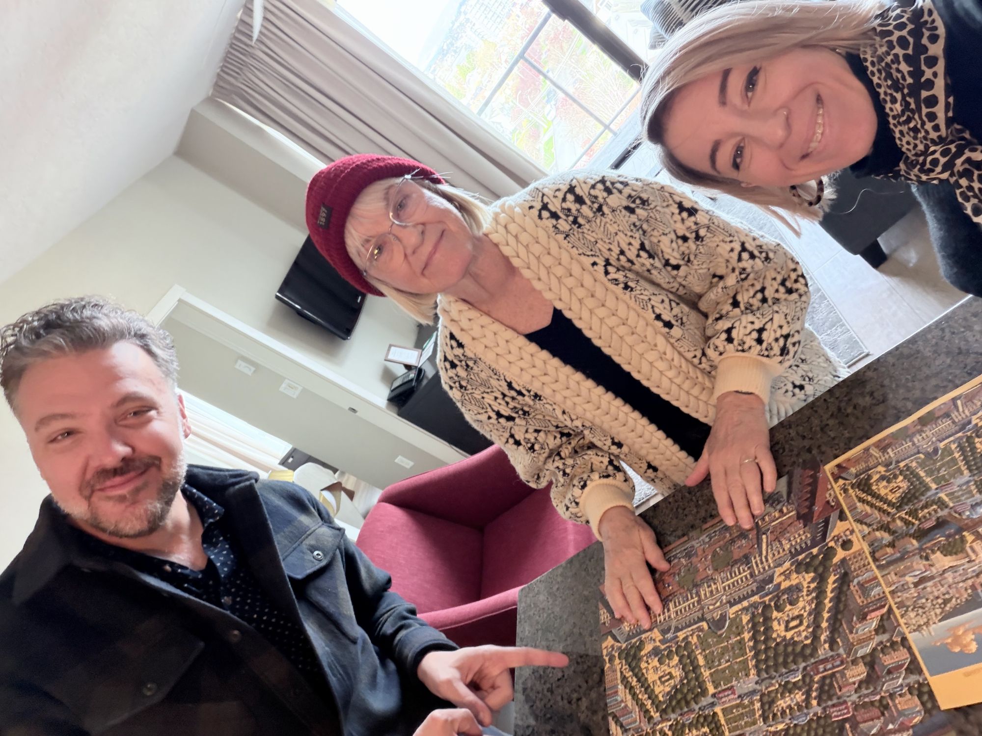 This morning we took our time at the hotel. It was partly because Esther had brought a jigsaw puzzle fup rom the lobby and we had started it in our room on the kitchen counter. We sorted the edge pieces, did the border and some of the easier sections of it before going to bed.  The rest was looking like it would be very difficult. And it was. But there were three of us and it just wasn’t the right thing to leave it. We worked on it right up to check out time and got it done. Teamwork and anti-puzzle-abandonment syndrome in play.