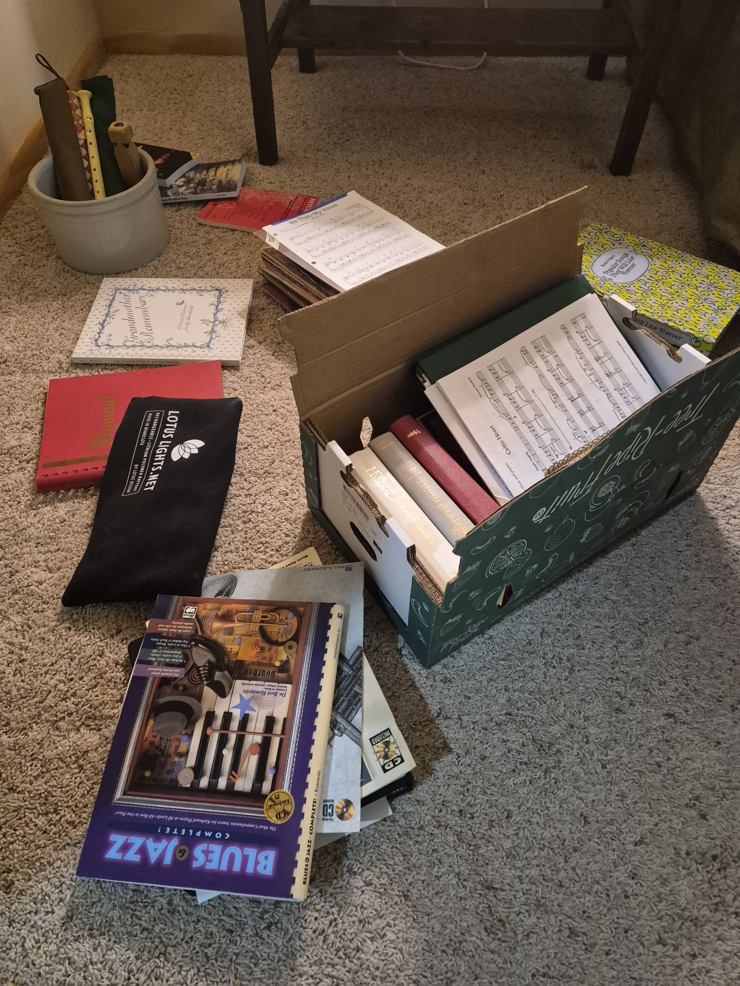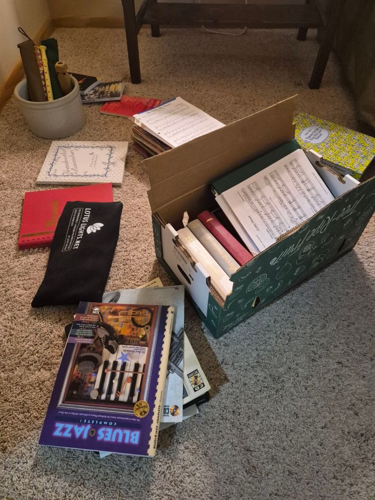 So, I’m on the floor sorting through music. Some of it looks so complicated and hard that I know I’d have to be practicing hours to play it. I’m not going to be doing that. My fingers don’t bend the way they used to. I no longer can play guitar. I no longer have a piano and most music doesn’t sound the same on my keyboard. I still enjoy listening to music and that is probably the only way music will be in my life going forward. But it’s hard to dispose of those hymn books that were a big part of my life. It’s hard to see that stack of solo piano music that cost $$$ and admit that it’s not going to be used in my future.
