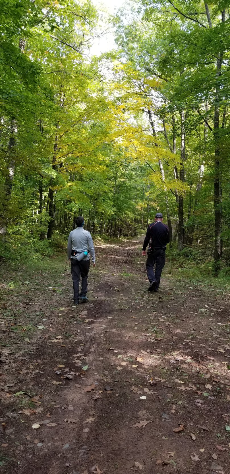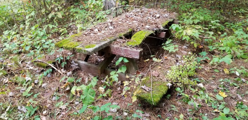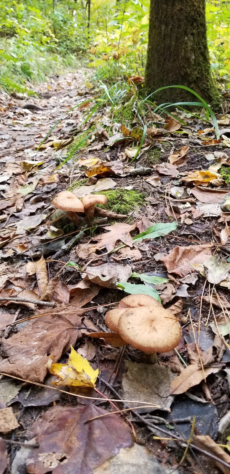 This little guy, about head high on the trunk of a tree, amazing!Can you spot the camouflaged picnic table?One more.No, one more.Some trail worker forgot their saw.I spent a lot of time looking at the path because it was always so lovely.About mile 6 we left the single track trail and did a mile on the larger ski trail. We (the girls) were getting tired and the ski trail was straighter and smoother.