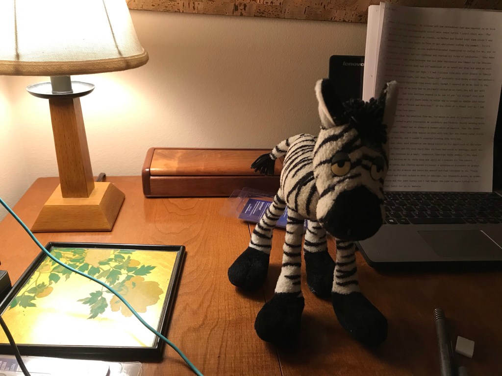 There were a couple good suggestions for naming my zebra and I was trying them both on for the right feel. Tonight, I’m finding myself mentally calling him Zeb, which is short for Zebedee. I’m not even thinking hard about it so I guess it’s a natural. He’s responding to it nicely.