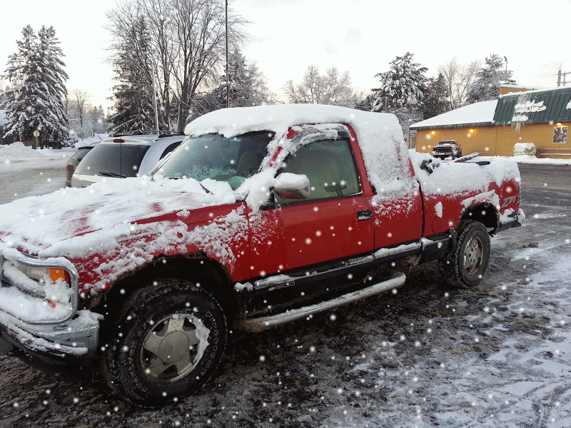 Today Mom and I spent the whole day at the house we are helping to pack up for our friends. We’ve nearly got the upstairs conquered. Tonight, and by that I mean 5 pm, I went out in the darkness to put a couple things in the truck and was surprised and a bit alarmed at the weather. It had been raining, just above the freezing point, all day. The water had been dripping off the roof onto a pile of metal bound for the recycling station, making a loud sound like a running faucet. But now, it was snowing and the wind had picked up. There were two inches of white stuff on the ground already and clouds of it were being hurled around, blizzard style.