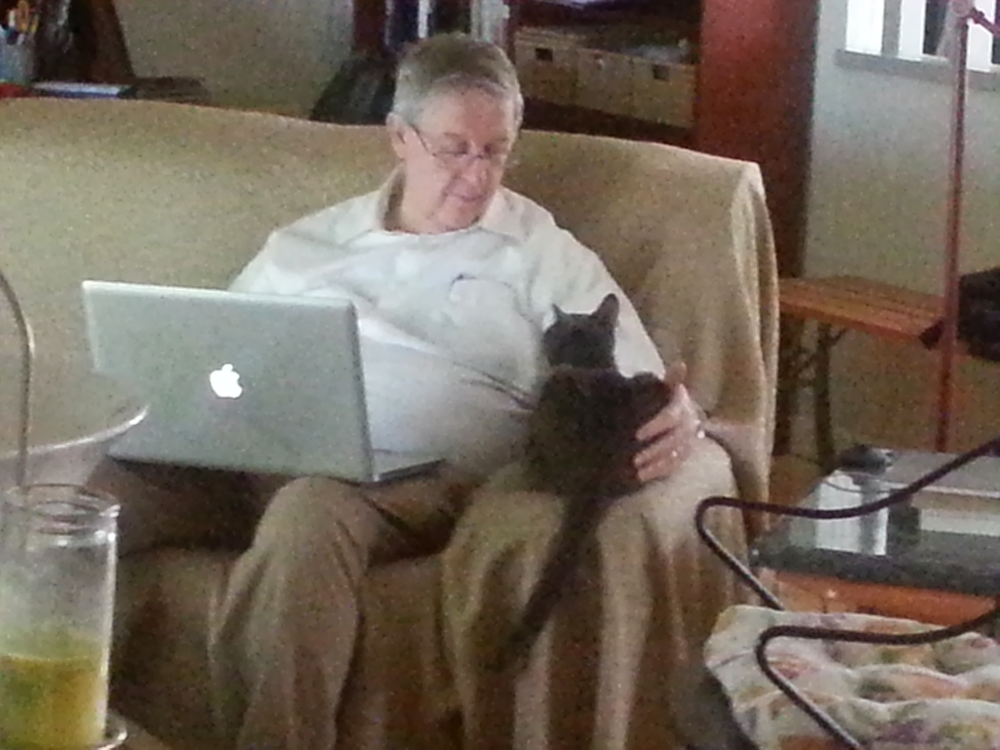Shadow accompanied me on the difficult journey of watching my husband deteriorate and die. She spent hours sitting on his lap too, waiting for him to pet her or tease her with the little laser flashlight. She noticed when he was gone, for sure. Our whole routine changed in many ways.