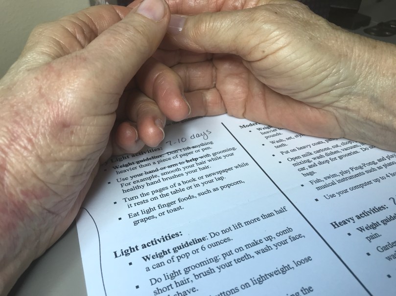 I’m now weaning off the splint. The therapist I saw this week knows my history of poor compliance. She kind of moved quickly through the “very light” and “light” activities (see sheet in picture) because I had already been doing those things and more. Although I’ve probably caused myself more pain by moving too fast, the doctor didn’t think I had displaced any of her work – my hand looked right from the outside and that was comforting. I fully expect the next few months to bring complete recovery of my thumb. I wish I could say the same for the other joints on both hands.