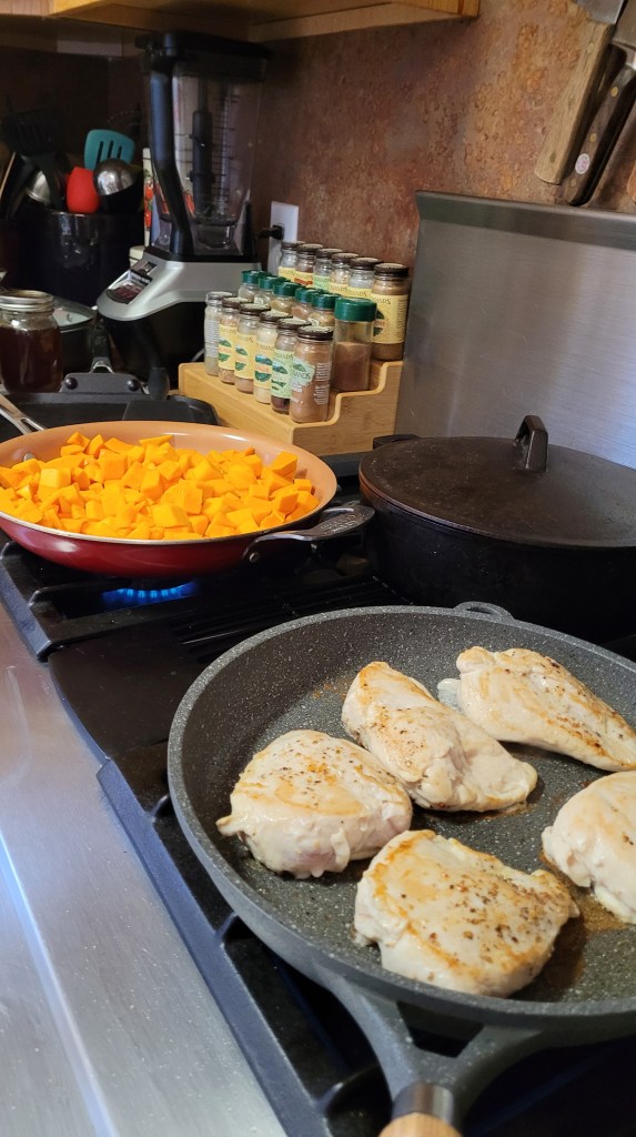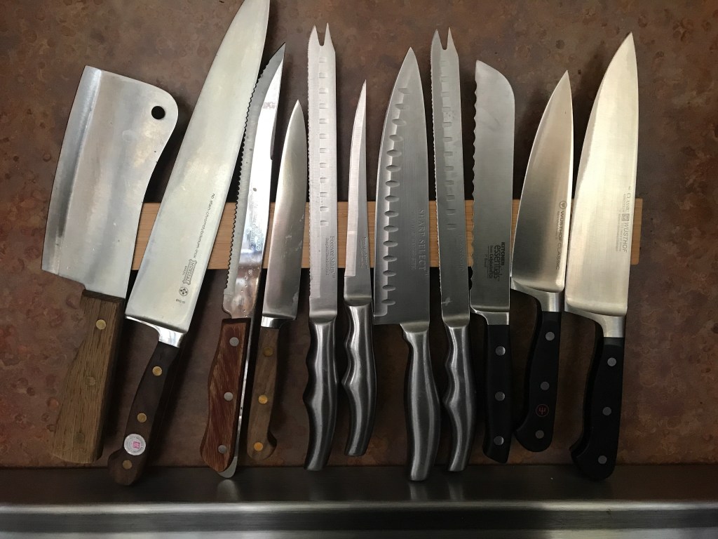 Oldest daughter J, on the other hand, was early into amateur chef behavior. Even on our hike on the Appalachian Trail, she was the one who had to bring real coffee, and fixings for blueberry pancakes. Now I have given up learning how to use all the machines she has in her kitchen. Electric crepe griddle, blenders, choppers, mixer, espresso machine, ice cream maker, air fryer, steamers, driers, toasters, more – I just can’t think of them all. I find cooking with her very interesting because it’s about the only time I really use a recipe, and I get to learn a new gadget. I am in awe of her knife collection, and her many pans.