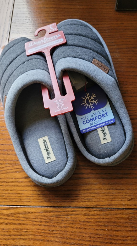 I had time to brave Walmart to pick up prescriptions for the husband and get some groceries. He had been wanting some slippers without a back that he could put his foot into easily, and I found some in his usual size. But no, they felt too small, so later I walked back to Walmart for the next larger size. Again, no. They felt like “shackles” and necessitate lifting one’s feet up with each step. I am done with the slipper game.