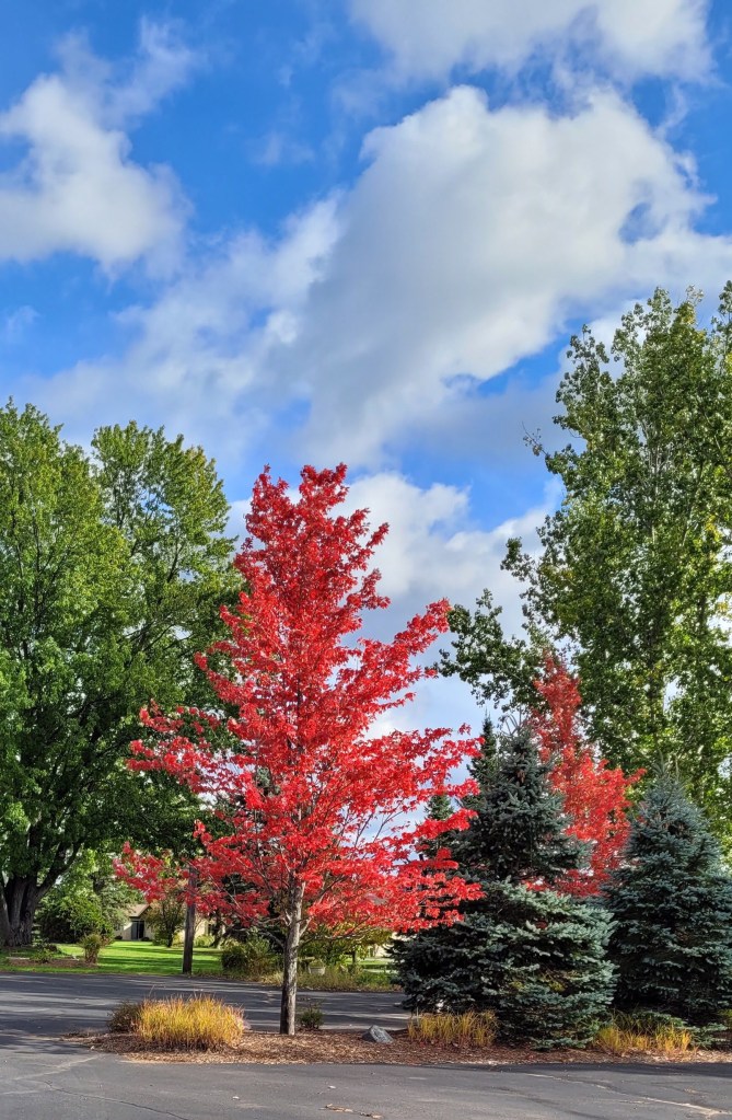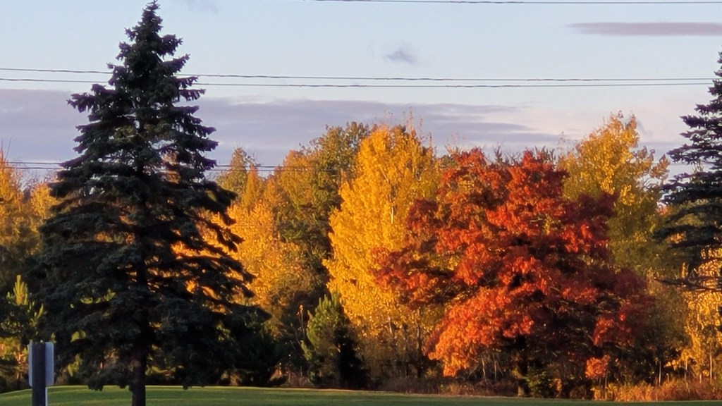 It is autumn. Here in Hayward, Wisconsin, there are a few weeks in September and October when there is still a lot of blue sky and water but most everything green becomes something else. There is blazing orange, glowing yellow, and vivid red among the dark green pines. The contrast is breathtakingly beautiful.