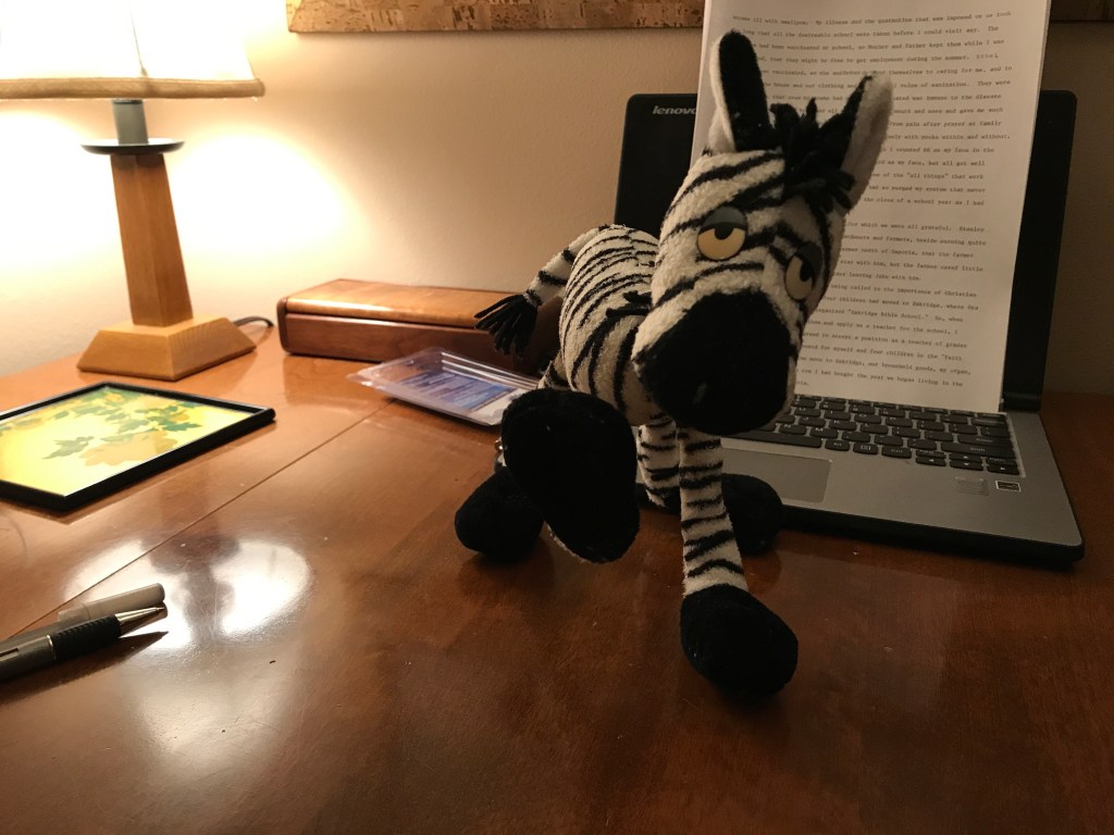 There were a couple good suggestions for naming my zebra and I was trying them both on for the right feel. Tonight, I’m finding myself mentally calling him Zeb, which is short for Zebedee. I’m not even thinking hard about it so I guess it’s a natural. He’s responding to it nicely.